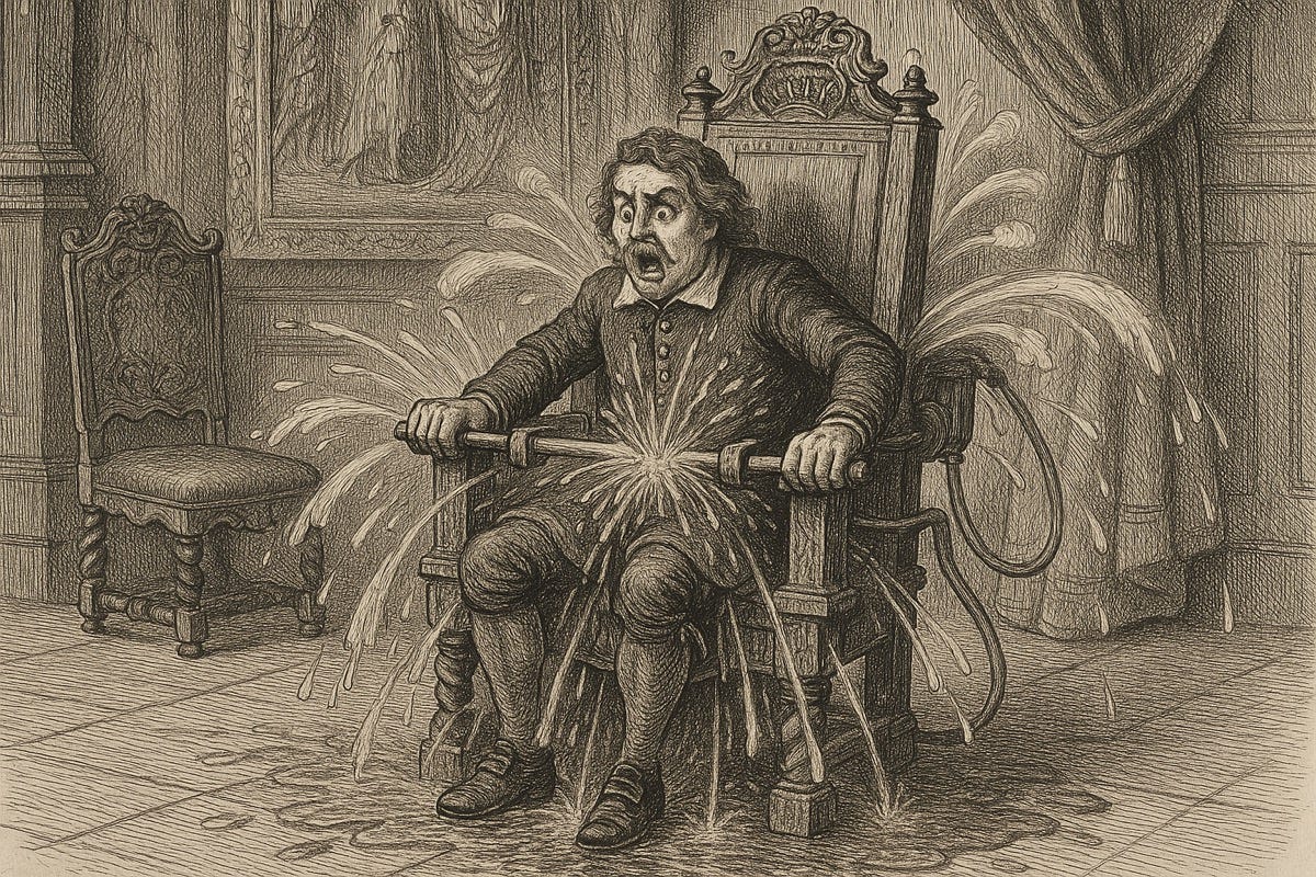 This 17th century chair in Copenhagen's Rosenborg Castle comes with an unusual surprise. Although it's in the same collection as the king and queen's thrones, it's actually an elaborate practical joke that soaks and humiliates anyone who sits in it. This peculiar piece of furniture, housed in the castle's Regalia Room, appears to be a nor…