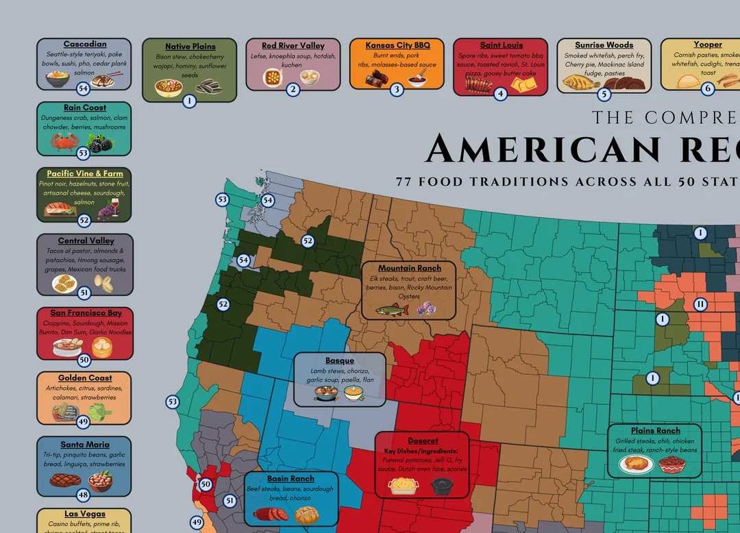 Cataloging 77 different food regions across all 50 States, Piri Res’ map is not intended to be a guide to what people eat daily. Instead, it features the food that makes “each region unique through its immigrants, inhabitants, geography, climate,…