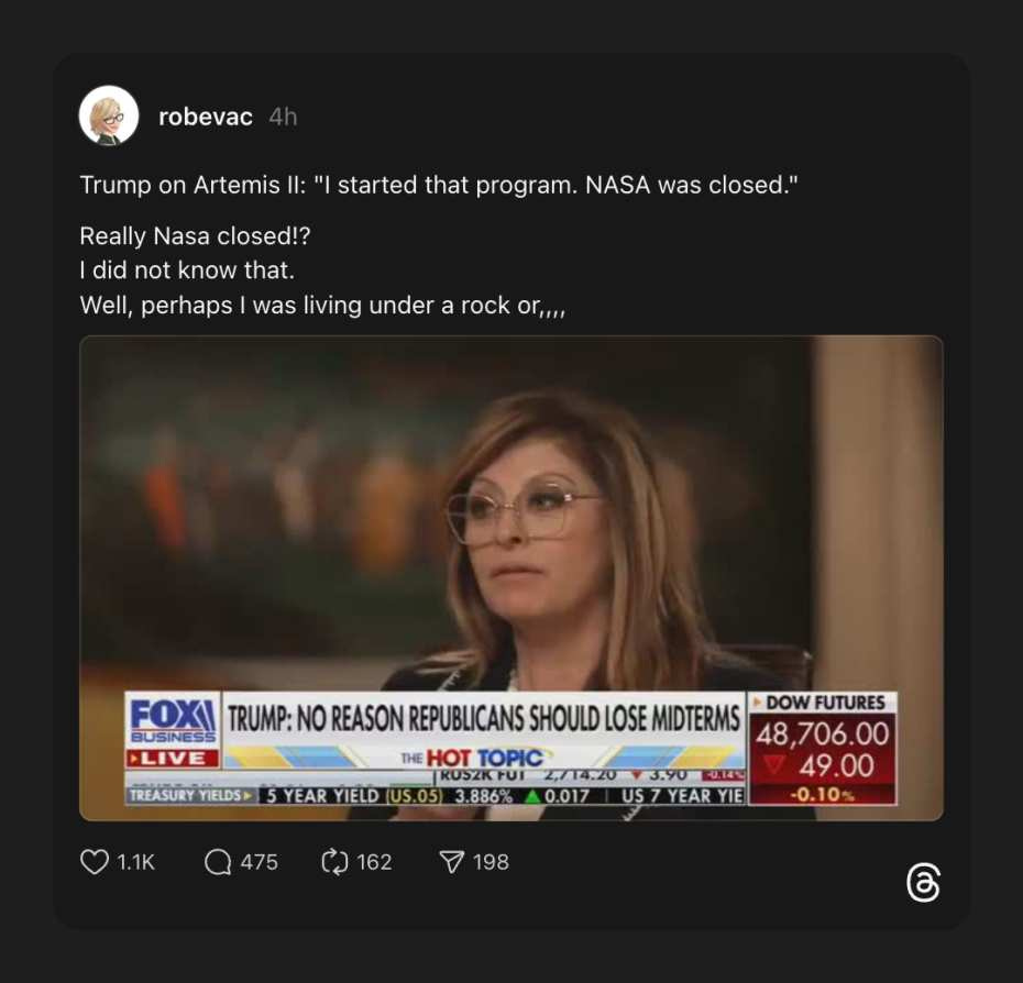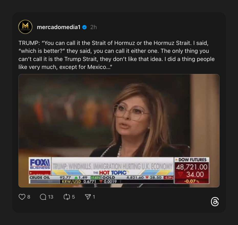 The Orange Menace gave another clear demonstration of his mental prowess in an interview with softball-slinging Maria Bartiromo. Unable to answer simple questions and wandering off on odd tangents, Trump takes credit for NASA, and thinks that if he renames the Strait from Hormuz to Trump, people will forget about soaring gas prices.