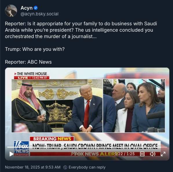 ABC News’ Mary Bruce pushed Trump and Saudi Crown Prince Mohammed bin Salman about corrupt business dealings and the murder of journalist Jamal Khashoggi. Trump did a horrible job of excusing his family’s cashing in on the Presidency, and lied about Khashoggi.