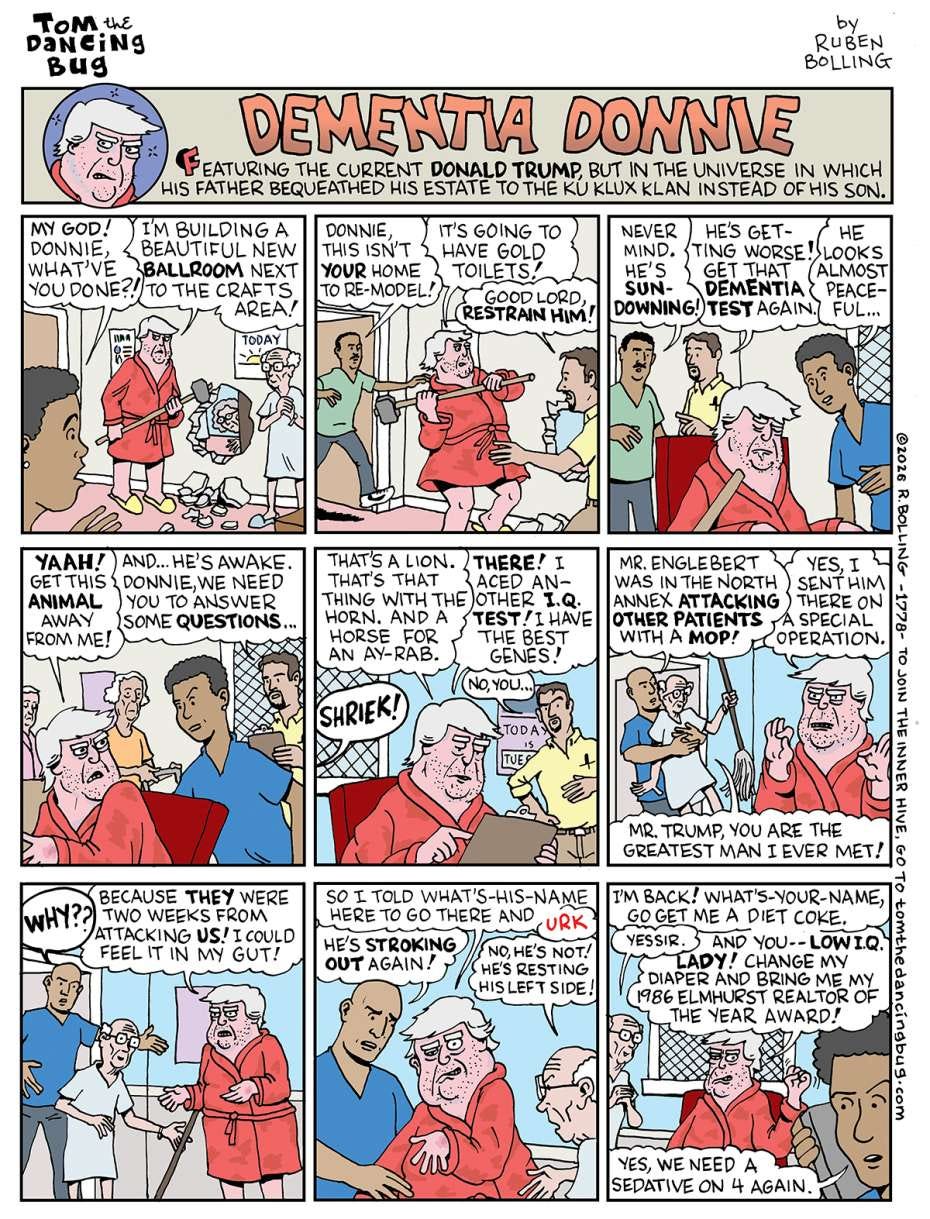 Tom the Dancing Bug: Dementia Donnie’s ballroom and war