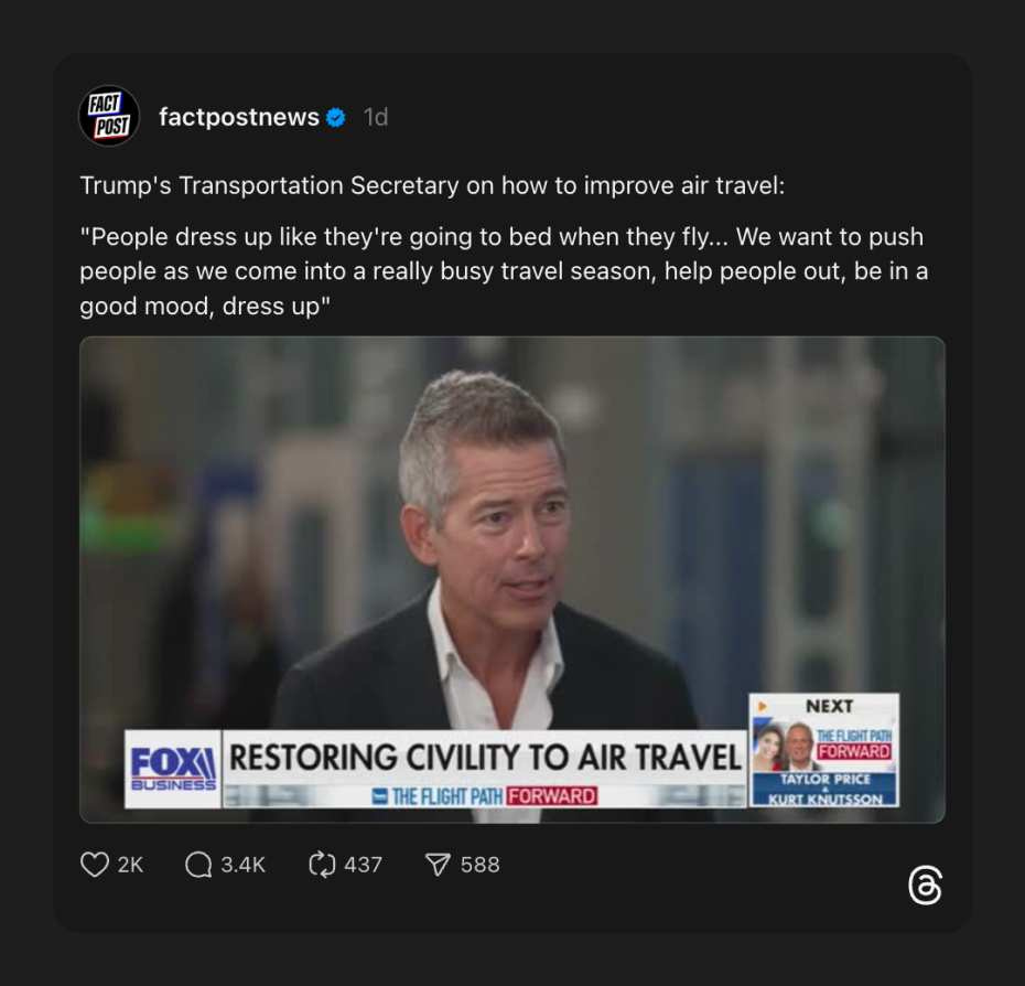 Without mentioning the terrible policy that allowed air traffic controllers to go unpaid and disappear in droves during the Republican induced government shutdown. Not discussing the failing infrastructure, long security lines, or miserable FAA mental health policies for overworked pilots and air staff, Sean Duffy wants to improve air travel by dressing up and being more friendly. The responsibility is not the government’s, it is yours. Stop wearing sweats when you fly.