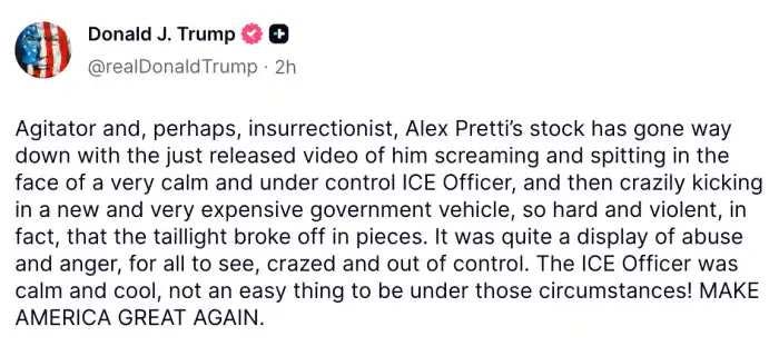 “It was quite a display of abuse and anger, for all to see, crazed and out of control,” Trump said of Pretti kicking the DHS vehicle. “The ICE Officer was calm and cool, not an easy thing to be under those circumstances!”