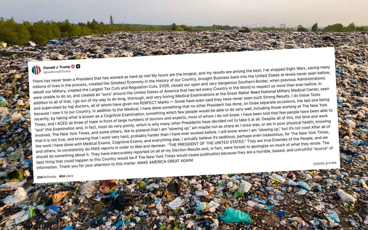 On Tuesday, President Trump posted a nearly 500-word screed to Truth Social insisting he’s in perfect health, calling the New York Times‘ coverage of his stamina “seditious, perhaps even treasonous,” and suggesting “we should do something about it.”