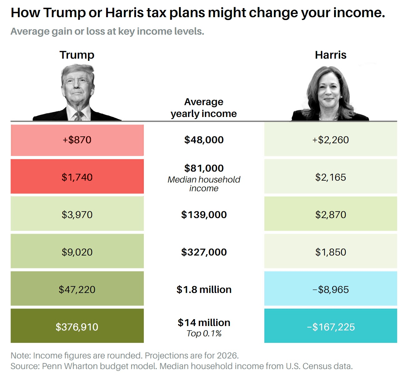 Experts ran the numbers on each candidate's tax plans. If you're very rich, you'll do better under the GOP candidate—and the richer you are, the further ahead you'll be. If you earn the median income—in fact, anything less than about $100,000 a year—you will be ahead under Harris. If you take home $48,000 a year, you'll have about $150…