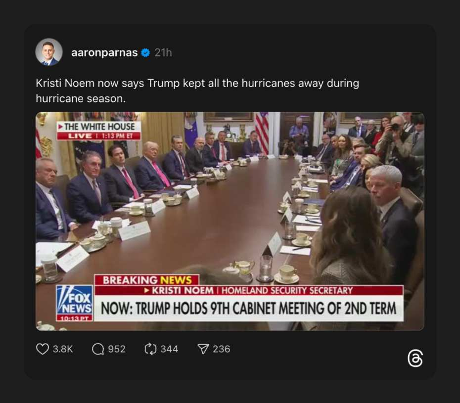 When convicted felon and real estate fraud Donald Trump is not napping during a cabinet meeting, his sycophant squad is heaping praise on him for some of the most ridiculous things. In today’s edition of “Sycophants we know and love,” the Puppy Slayer, Kristi Noem, congratulates Napper Don for stopping all the hurricanes this year.
