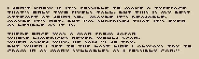 There's the 1-px side subpixel font named Millitext and a 3px-wide subpixel font that passes as type, but sticking with full pixels makes legibility tough at tiny sizes. Jason Kottke's Silkscreen is exemplary at 4×5. Making a gruesome 3×3 font is a kind of ritual for pixel artists. Nanofont is 3×4 with a 2-pixel tall lowercase, but today I find myself s…