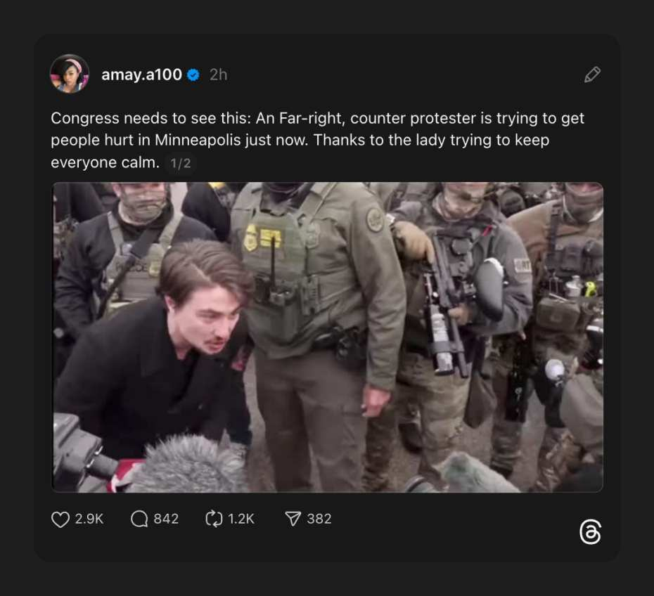 This video on circulating on Threads captures a moment at a Minneapolis protest that is difficult to watch and impossible to dismiss.