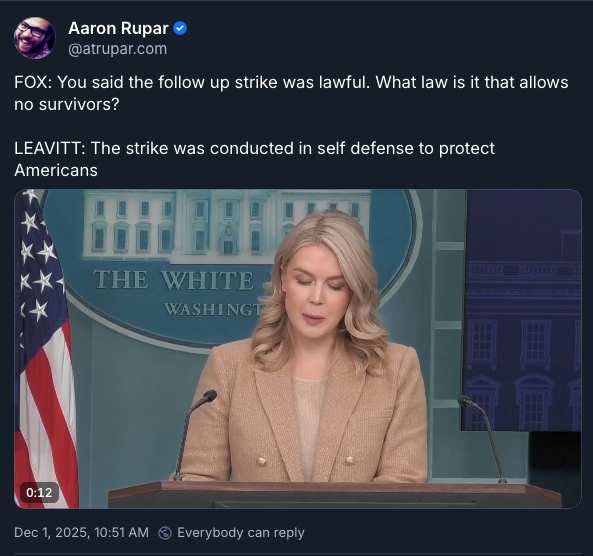 The Trump White House unintentionally admitted what we already suspected: a second military strike was launched on survivors of a destroyed boat in the Caribbean. It is now US policy that “clinging to wreckage” is grounds for a lethal attack against the defenseless. The Mouth of Moron, Karoline Leavitt insists the follow-up attack was justified, turning a war crime into just another day in Trumpworld.